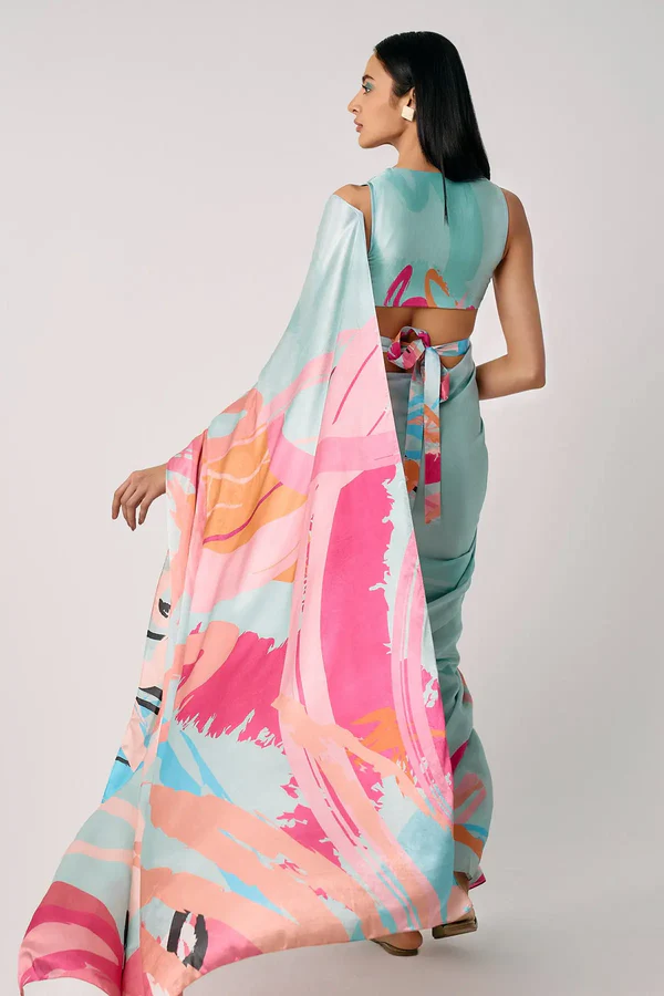 Upgrade your style with our vibrant satin Aanya saree. Adorned with colorful abstract graffiti by an artist, this versatile piece boasts a natural sheen. Perfect for all ages, its spring colors add a quirky touch, making it a must-have for every wardrobe.